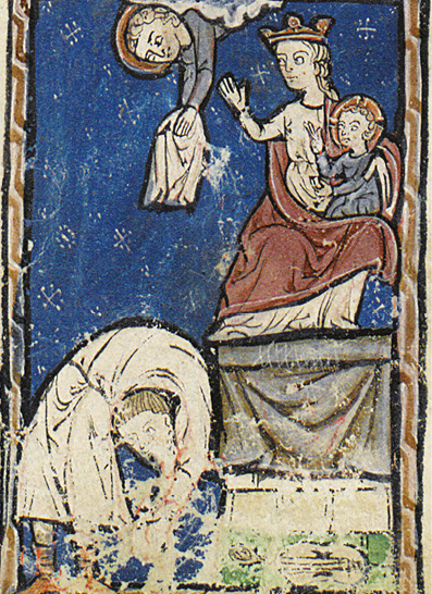 The scene’s construction conforms with other depictions of miraculous Marian images. The artist takes care to convey that the miracle is enacted not by the statue itself but by divine potency. The image that the tumbler honors is shown to remain a representation on the altar as the wonder takes place. But the staging as portrayed in the bas-de-page departs from these other portrayals in not showing a life-size Virgin who intervenes. In contrast, the figure emerging from the heavenly stratocumulus at the top looks to be a divine emissary of another sort, anything but hands-off. In the world of medieval miracles about Mary, no sky is completely overcast: every cloud, even the blackest thunderhead, has an angelic silver lining.