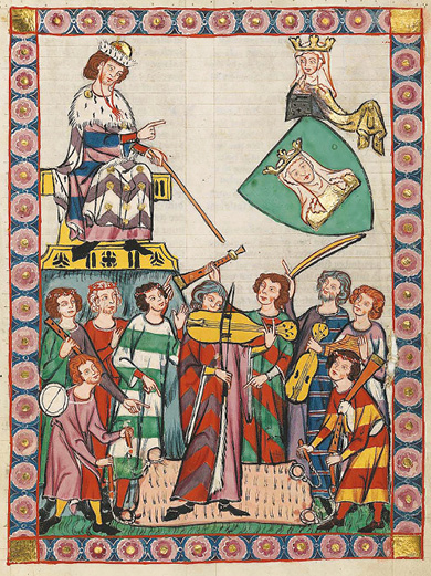Fig. 1.28 Frauenlob and his fellow performers. Miniature, 1300–1340. Heidelberg, Universitätsbibliothek, Bibliotheca Palatina, Cod. Pal. Germ. 848, fol. 399r. Image courtesy of Universitätsbibliothek Heidelberg, CC BY-SA 3.0.