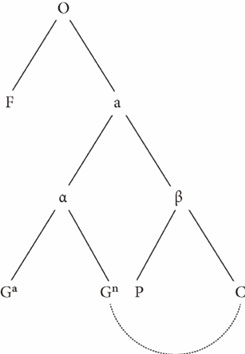 In the sort of genealogy that a stemma provides, letters from the Greek and Roman alphabets customarily serve to signify individual manuscripts. Each such designation is called a siglum. In this case the letter O represents the lost original or archetype, which transmitted the urtext. The letter a stands for an early exemplar that was made as a copy of the archetype, although it, too, has not lasted. The alpha and beta, α and β, that come below the Roman letter are two further exemplars that were copied from it. Neither of these is extant either; they also are hypothetical. Tangible and legible reality arrives in the next stage. From each of α and β, two handwritten versions were copied that survive. In each pair, the text of one shows signs of having been affected by consultation of one in the other couple. To indicate this crossover, the sigla of these two are joined by the dashed line that traces an arc between them.