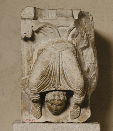 Fig. 1.19 Portion of a pilaster with an acrobat, ca. 1150–1170, Lyonnais. Limestone,30.8 × 21 × 26.7 cm. New York, Metropolitan Museum of Art.