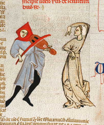 Fig. 1.25 Fiddler and dancer. Miniature. Graz, Universitätbibliothek Graz, MS 32, fol. 106v. Image courtesy of Universitätsbibliothek Graz. All rights reserved.