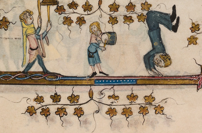 Fig. 1.16 Musician and tumbler. Miniature, late thirteenth century. Lausanne, Bibliothèque cantonale et universitaire de Lausanne, U 964, fol. 343v. Image courtesy of the Virtual Manuscript Library of Switzerland, www.e-codices.unifr.ch, CC BY-NC.