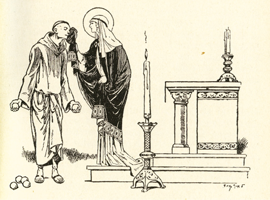 Fig. 1.21 The Virgin wipes sweat from the juggler’s brow. Illustration by Henry Morin, 1928. Published in Anatole France, Abeille / Le Jongleur de Notre-Dame / Les Pains noirs, ed. R. L. Graeme Ritchie (London: Thomas Nelson & Sons, 1928), 133.